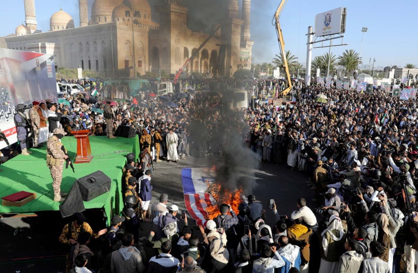 A banner depicting U.S. and Israeli flags is burned, as protesters, mainly Houthi supporters, rally to show support to Palestinians in the Gaza Strip, in Sanaa, Yemen December 13, 2024.